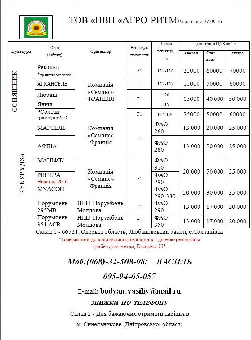 Научно-производственное предприятие «Агро-Ритм» имеет собственную селекцию кукурузы и подсолнечника. Обрабатываем 6000 га плодородных земель ,каждый гектар с которых засеян семенами не ниже элиты . В своем рабочем штате имеем 8 научных сотрудников из селекционно-генетических учереждений Украины ,3 с которых являются «Докторами наук»,а 5 –«Кандидатами в доктора наук» . Исходный материал получен из передовых компаний Франции, Сербии и Румынии, с участием и научным сопровождением селекционеров этих стран. НПП «Агро-Ритм» закупает родительские формы подсолнечника и кукурузы в «Евралис Семанс» Франция, Национальном институте сельскохозяйственных исследований и развития Фундуле Румыния, Малопольской академии растений Польша, «Осева Ексимпо Прага» Чехия, ГУ Институт растениеводства «Порумбень» Молдавия. Сотрудничает с Одесским СГИ, Днепропетровским Институтом кукурузы, Институтом генетики Киев, Мироновским СГИ и многими другими.